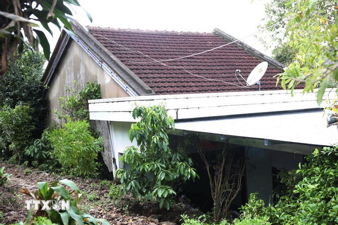 Một căn nhà bị sụt lún hoàn toàn sau trận mưa lũ lịch sử ở Đắk Lắk. (Ảnh: Tuấn Anh/TTXVN)