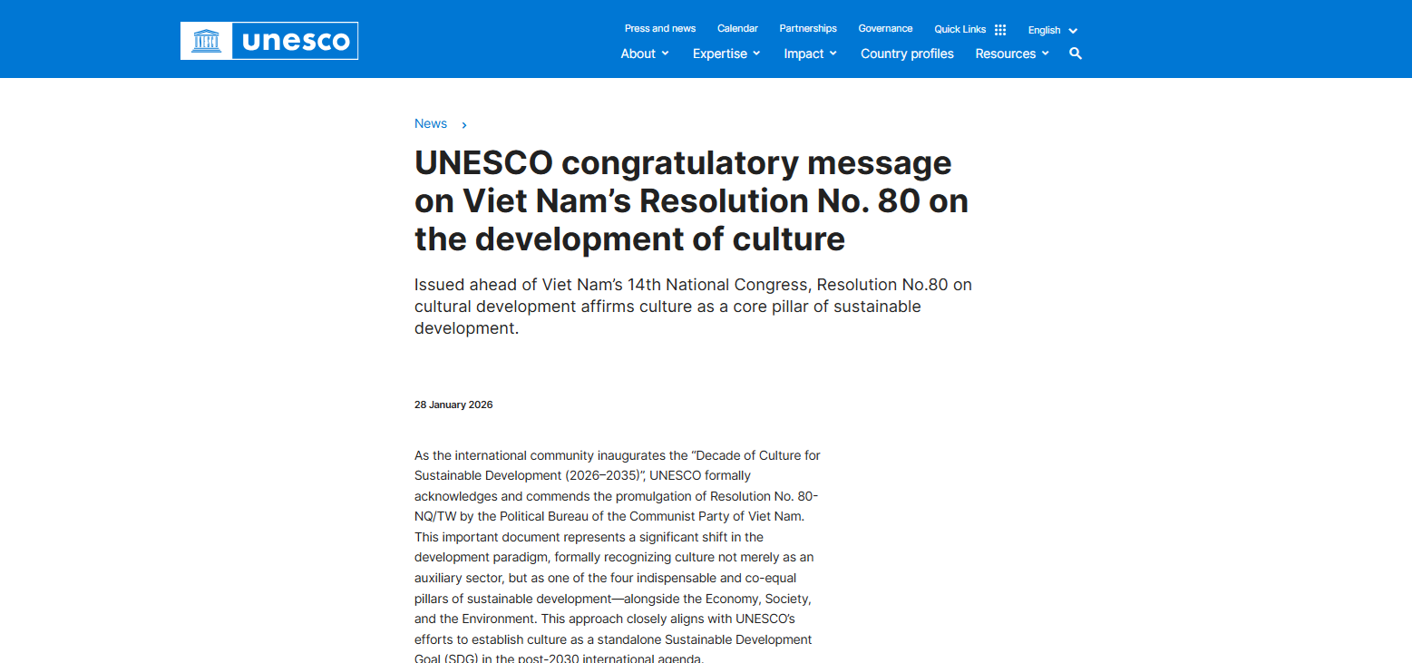 Trong thông điệp, UNESCO trân trọng ghi nhận và chúc mừng việc Bộ chính trị Đảng Cộng sản Việt Nam ban hành Nghị quyết số 80-NQ/TW về phát triển văn hoá. Đây là một văn kiện đặc biệt quan trọng, thể hiện sự chuyển đổi tư duy phát triển, theo đó văn hóa không chỉ là một lĩnh vực bổ trợ, mà là một trong bốn trụ cột đồng đẳng của phát triển bền vững, bên cạnh kinh tế, xã hội và môi trường. Định hướng này của Việt Nam trùng khớp với tầm nhìn chung và nỗ lực của UNESCO trong việc đưa văn hóa trở thành một Mục tiêu phát triển bền vững độc lập trong chương trình nghị sự toàn cầu sau năm 2030.
