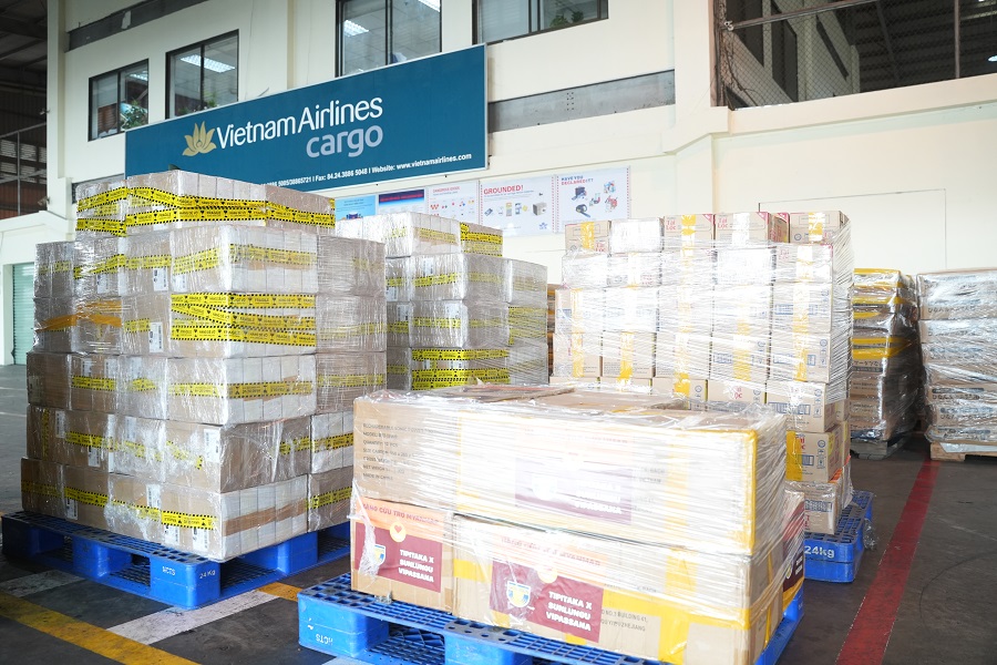 Ngay từ sáng sớm, xe chở hàng cứu trợ của các đơn vị thuộc Bộ Quốc phòng và Bộ Công an Việt Nam đã tập kết tại kho hàng của Vietnam Airlines ở Nội Bài, chuẩn bị cho việc xử lý và vận chuyển tiếp theo.