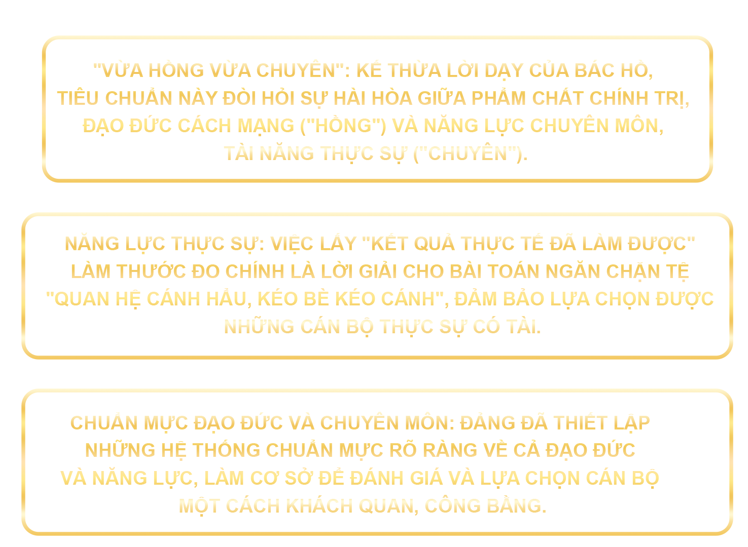 Các tiêu chuẩn lựa chọn cán bộ cũng được cụ thể hóa một cách rõ ràng. Theo phân tích của ông Nguyễn Túc, các tiêu chí này được xây dựng trên nền tảng tư tưởng của Chủ tịch Hồ Chí Minh và được cập nhật cho phù hợp với yêu cầu thực tiễn: