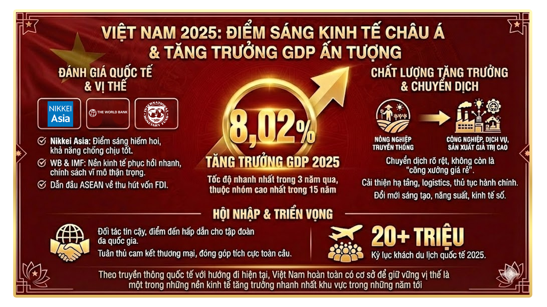 Theo tờ Nikkei Asia, mức tăng trưởng 8,02% trong năm 2025 là tốc độ nhanh nhất của kinh tế Việt Nam trong ba năm trở lại đây, đồng thời nằm trong nhóm các nền kinh tế có mức tăng trưởng cao nhất trong vòng 15 năm. Việt Nam cũng liên tục nằm trong nhóm dẫn đầu ASEAN về thu hút vốn FDI.