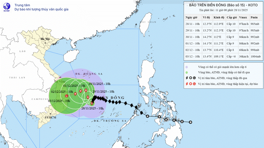 Theo dự báo của Trung tâm Dự báo khí tượng thủy văn Quốc gia, hồi 13 giờ ngày 28/11, vị trí tâm bão ở vào khoảng 12,4 độ Vĩ Bắc; 112,7 độ Kinh Đông, cách đảo Song Tử Tây khoảng 190km về phía Tây Bắc. Sức gió mạnh nhất vùng gần tâm bão mạnh cấp 10 (89-102km/h), giật cấp 13. Di chuyển theo hướng Tây Nam, tốc độ 5km/h.