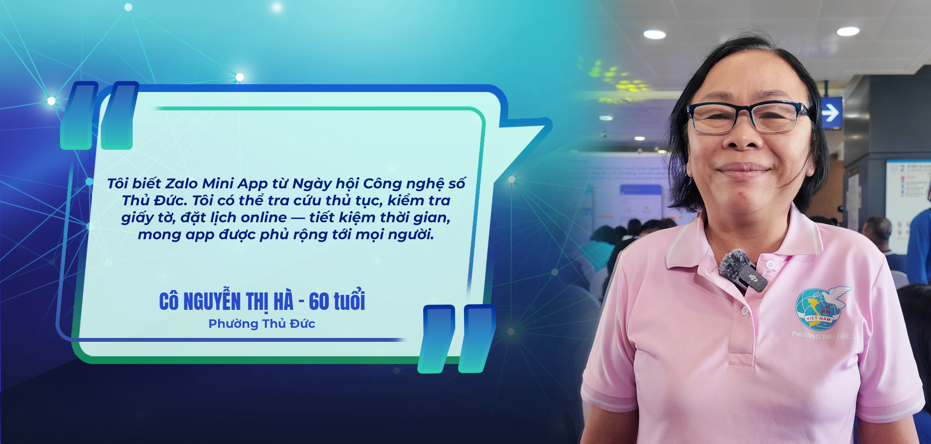 Các tình nguyện viên, cán bộ phường Thủ Đức tận tình hướng dẫn người dân – đặc biệt là cô chú lớn tuổi – cài đặt và sử dụng Zalo mini app phường/xã ngay tại Ngày hội Công nghệ số, giúp mọi người làm quen với các dịch vụ hành chính số ngay trên điện thoại